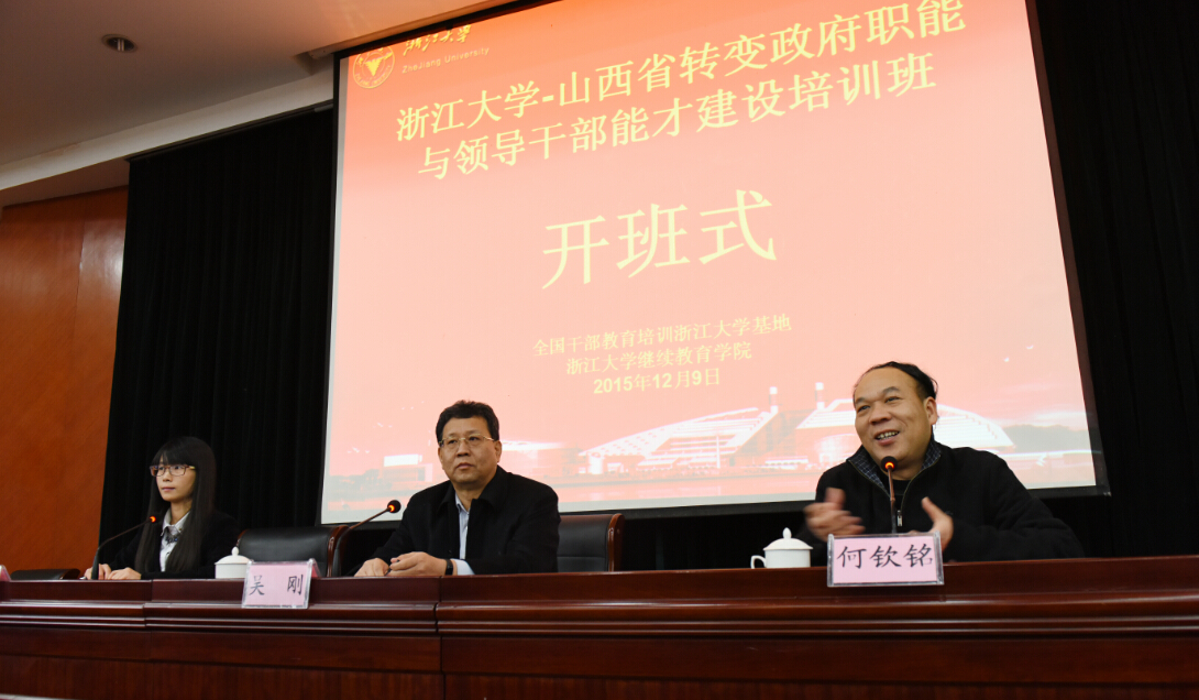 12月9号上午,山西省转变政府职能与领导干部能才建设培训班在浙江大学华家池校区开班。山西省法学会专职副会长兼秘书长吴刚,浙江大学继续教育学院院长、全国干部教育培训浙江大学基地常务副主任何钦铭出席了开班仪式。来自山西省的政法委、经信委、机要局、水利厅、林业厅等13家单位的89位学员参加了为期5天的学习培训。