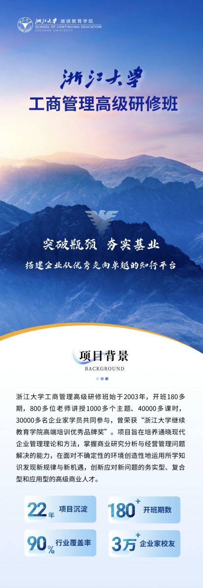 浙江大学工商管理高级研修班始于2003年,开班180多期,800多位老师讲授1000多个主题、40000多课时,30000多名企业家学员共同参与,曾荣获“浙江大学继续教育学院高端培训优秀品牌奖”。项目旨在培养通晓现代企业管理理论和方法,掌握商业研究分析与经营管理问题解决的能力,在面对不确定性的环境创造性地运用所学知识发现新规律与新机遇,创新应对新问题的务实型、复合型和应用型的高级商业人才。(点击查看招生简章)